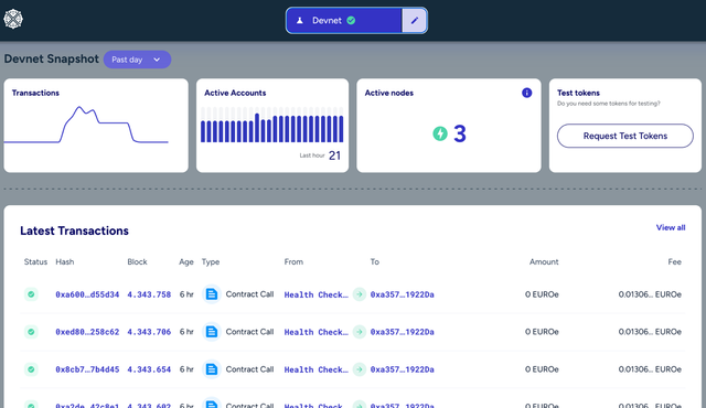 所有交易(包括发布、获取和使用数据空间中的资产)都通过分布式账本技术(DLT 或区块链)进行记录,从而创建一个不可变的记录。同时,所有交易也可以在用于该区块链网络的注册表浏览器中查看,如图 9 所示,即 Pontus-X Devnet 的开发网络。