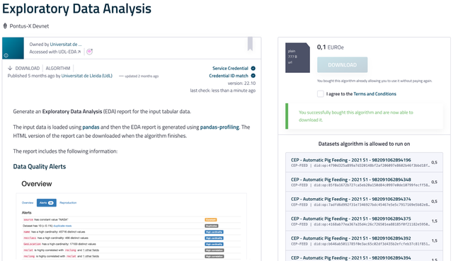 所有列出的资产的元数据摘要提供了关于其名称、标题、简要描述、价格、消费/销售数量和注册网络的信息。此外,每个资产都被标记为“下载”如果可以下载或“计算”如果不能下载,只能在数据计算环境中使用,这样就确保了资产所有者对其内容的控制权。另外,资产可以是数据集,标记为“DATASET”,也可以是数据处理服务,标记为“ALGORITHM”。