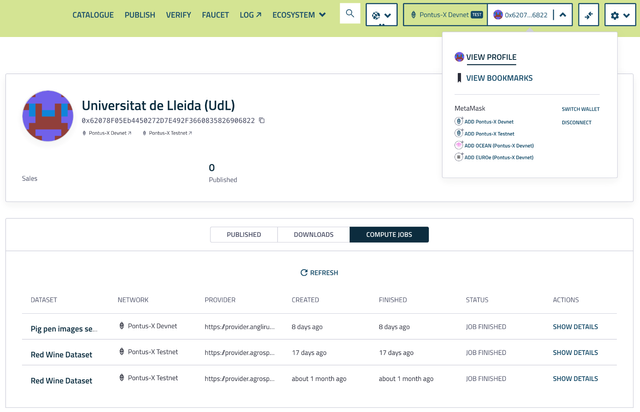 还可以通过数据空间市场查看您的使用历史记录,方法是转到与当前用户关联的“查看个人资料”选项,如图4所示。一旦连接了MetaMask扩展或类似的扩展来管理私钥,就会出现一个描述所有下载服务的完整列表。在“计算作业”部分,有一个关于激活的数据计算过程的总结,包括审计跟踪和访问先前计算结果的选项。