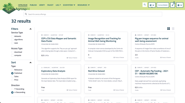 最简单的方式来发现发布在数据空间中的服务是通过主门户网站:portal.agrospai.udl.cat。